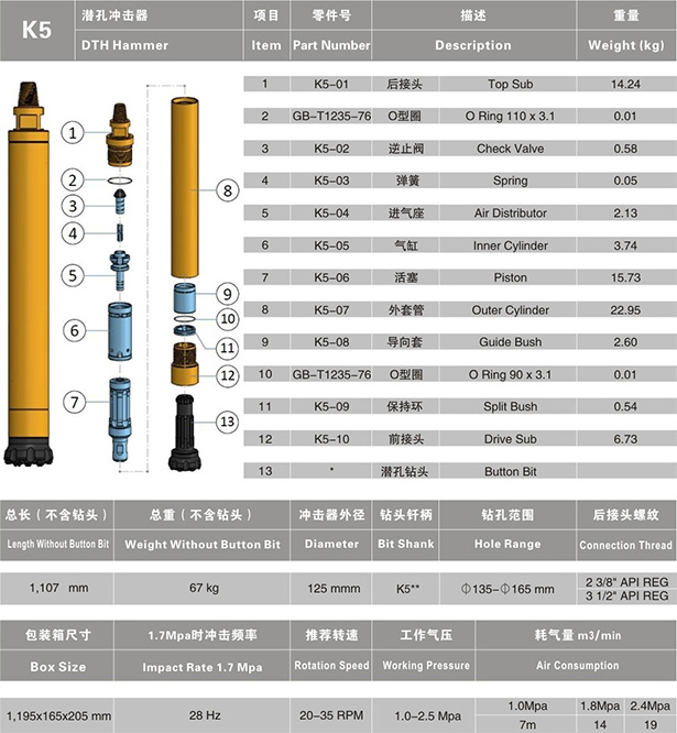 采用了当代最新凿岩理论设计冲击器内部结构尺寸,使冲击器获得最理想的能量传递,因此,冲击器凿岩速度快,耗风量低。采用了最优质的原材料和最先进的加工工艺,因此,冲击器性能稳定、寿命长。采用了最简单可靠并且拆装容易的内部结构,因此,冲击器故障低,维修方便。前接头采用了多头螺纹和外缸联接,因此,冲击器拆卸钻头容易。冲击器虽然独具设计,但前后接头可与市场常规的钻杆和钻头相匹配。